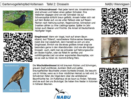 Bereits vor einigen Jahren wurde am Rande der Steuobstwiese ein Gartenvogel-Lehrpfad angelegt. Im Frühjahr 2019 wurde die Beschilderung unter Einbeziehung elektronischer Medien (QR-Codes) neu überarbeitet.